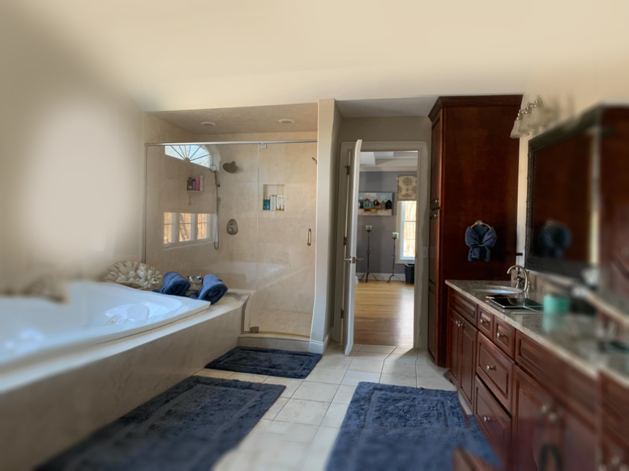 A dated bathroom was reimagined as a refined, spa-like space with deep blue cabinetry, a freestanding tub, and a brighter, more open layout.