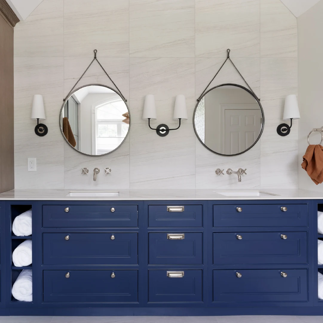 Deep blue cabinetry became a defining feature across the spaces, complemented by warm wood tones, light finishes, and carefully selected fixtures that add contrast, depth, and balance. Every detail was chosen to improve daily function while giving the home a more polished, custom feel.