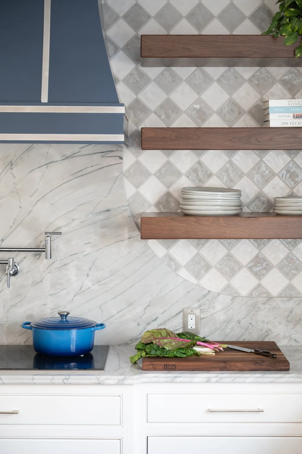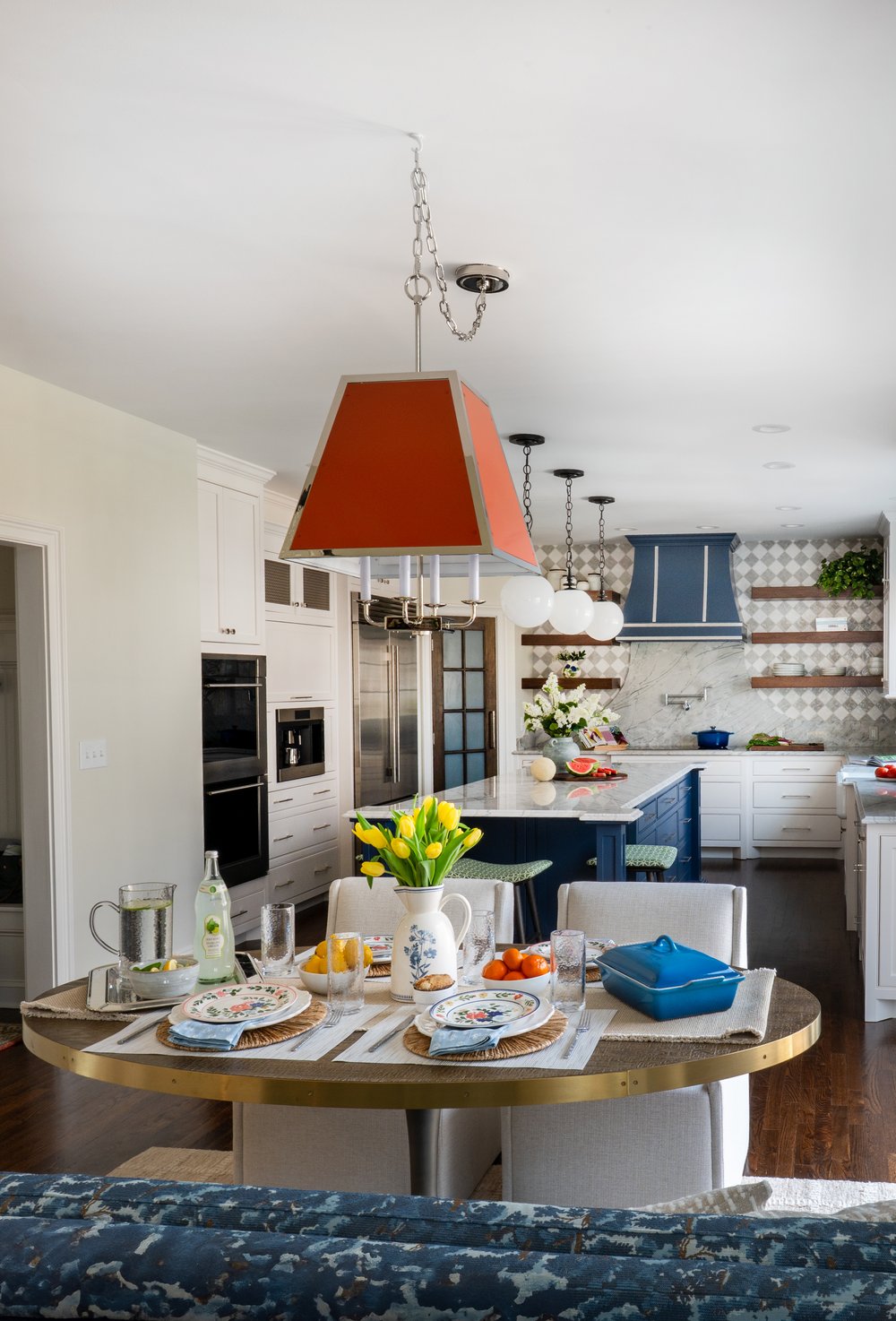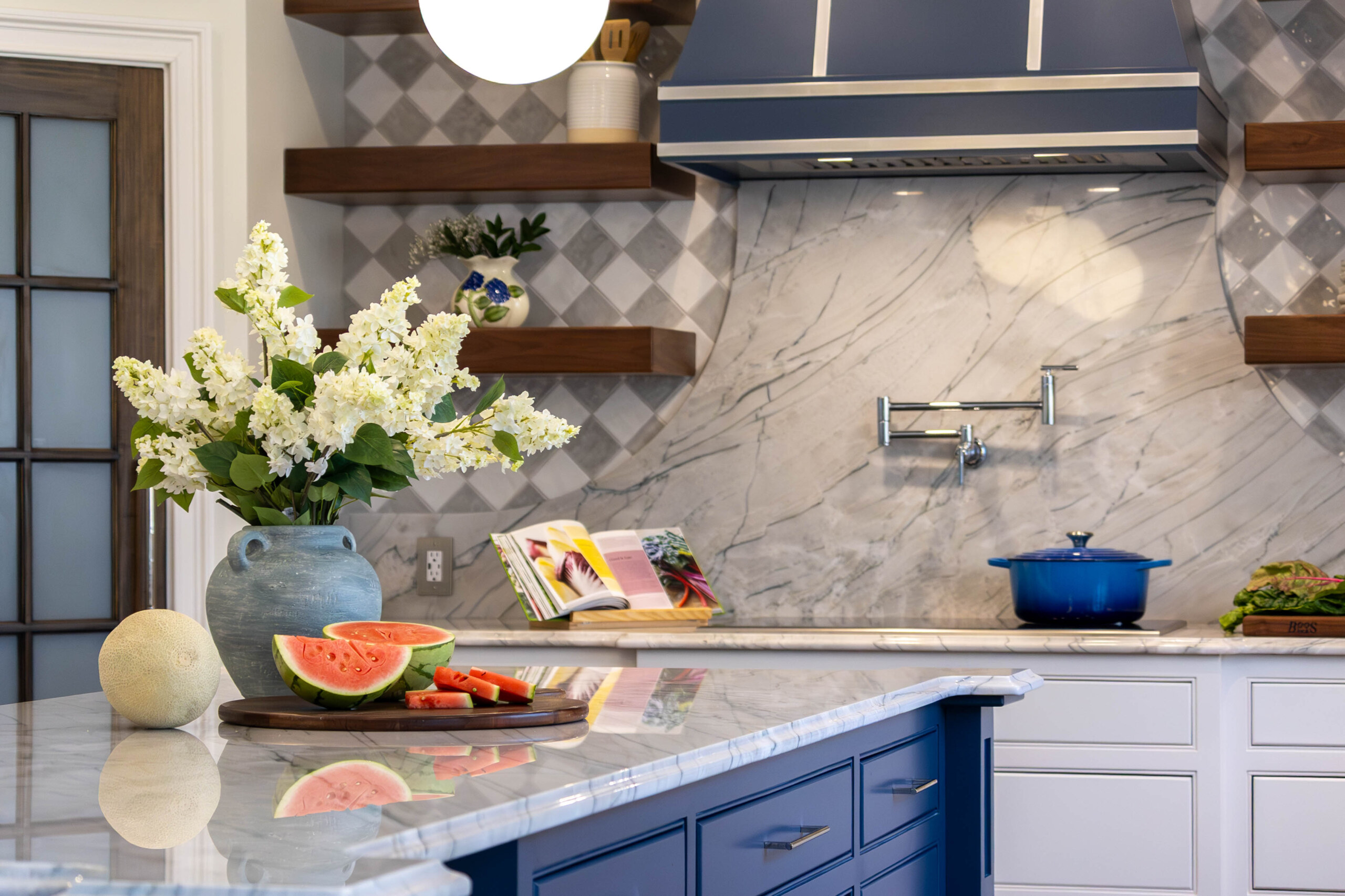 Designed by Sponzo Interiors, the layout centers around a deep blue island that adds rich contrast to the crisp white inset cabinetry and quartzite countertops with a premium ogee edge.